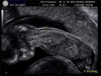Aus der Tabelle ist zu erkennen, dass das Risiko für das Down Syndrom mit dem Alter der Mutter zunimmt. Am Anfang der Schwangerschaft ist die Wahrscheinlichkeit einer Erbsubstanzstörung höher als am Termin, da bereits viele betroffene Kinder ohne Eingriffe von außen während der Schwangerschaft sterben. Die Nackenfalte stellt sich im Ultraschallbild im Bereich des hinteren Halses als ein dunkles Areal dar, welches auch bei fast allen gesunden Kindern in einer bestimmten Dicke (1-2 mm) zu sehen ist. Diese Nackenfalte ist normalerweise nur in der 11. bis 14. SSW darstellbar und verschwindet im weiteren Verlauf der Schwangerschaft. Anhand einer großen Studie der „Fetal Medicine Foundation“ in London mit über 100.000 Schwangeren konnte Prof. Nicolaides nachweisen, dass mit Zunahme der Flüssigkeitsmenge in der „Nackenfalte“ die Wahrscheinlichkeit für eine Erbsubstanzstörung ganz erheblich ansteigt. Die oben beschriebene Nackentransparenzmessung wird in meiner Praxis angeboten und durch die Fetal-Medicine- Foundation Deutschland (FMF) jährlich rezertifiziert. Wir erfüllen somit alle erforderlichen Qualitätsstandards die zur korrekten Durchführung dieses wichtigen Testverfahrens notwendig sind. Das abschließende Untersuchungsergebnis liegt in der Regel in 1-2 Tagen vor. |